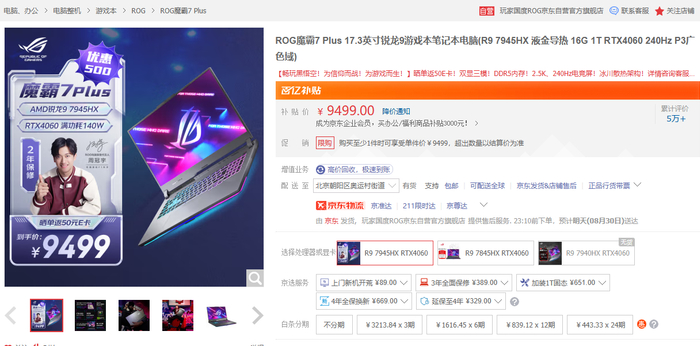 产品配置:锐龙9 7945HX/RTX 4060/16GB/1TB/17.3英寸2.5K 240Hz P3广色域IPS