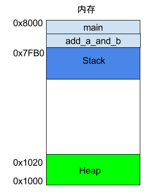 程序运行过程中,对于动态的内存占用请求(比如新建对象,或者使用malloc命令),系统就会从预先分配好的那段内存之中,划出一部分给用户,具体规则是从起始地址开始划分(实际上,起始地址会有一段静态数据,这里忽略)。