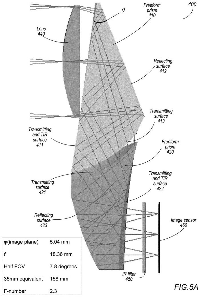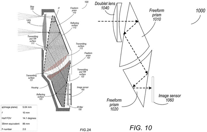 光看这张专利图,不难发现棱镜的主体还在,但不一样的是新方案将反射棱镜一分为二,而且中间断开的部分不是平整切割,而是凹凸不平的球状表面。