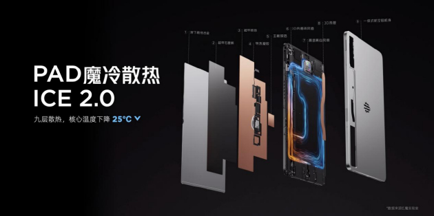 有强悍性能,散热必须拉满,红魔首次在平板上引入转速达20000转/分的高速离心风扇,并创造性地加入笔记本级别的3D热管,配合全球首创的3D内循环风道技术,加上9268mm²超导铜箔、29400mm²散热合金、超导石墨烯、导热凝胶以及航空铝箔等共同组成PAD魔冷散热 ICE 2.0系统,核心温度最高可以下降25℃,为平板的高性能运行提供有力支持。