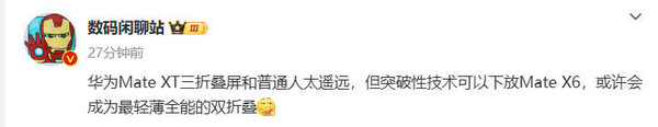 【CNMO科技消息】9月6日,知名爆料人士数码闲聊站放出了和华为Mate X6折叠屏有关的信息。该爆料人士表示,华为Mate XT三折叠屏和普通人太遥远,但突破性技术可以下放Mate X6,或许会成为最轻薄全能的双折叠。