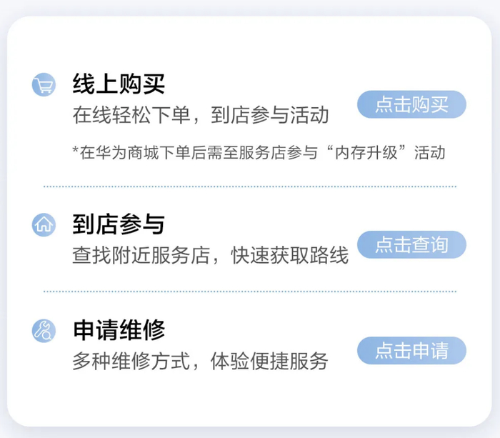 华为表示,参与条件的手机需无私拆、私修,主板无折断、焊点脱落、芯片私修、进液、腐蚀和变形等情况,有需求的用户可以在华为商城、附近线下服务店进行咨询。