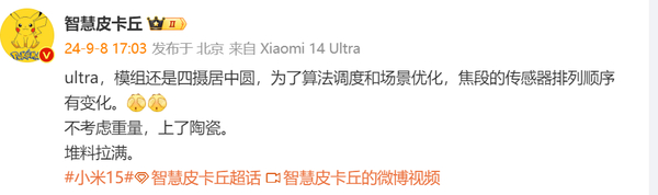据悉,小米15 Ultra模组设计延续四摄居中圆形布局,焦段传感器排列顺序有所调整以优化算法与场景表现。新机还将提供陶瓷版本(不计重量考量)。博主表示,小米15 Ultra堆料拉满。