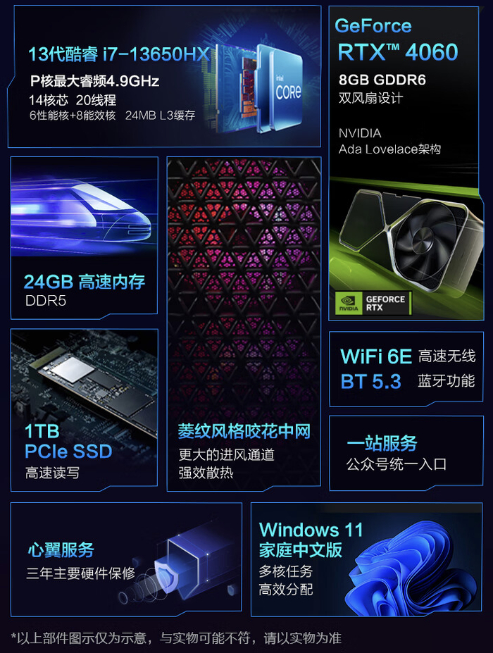 据介绍,该机搭载 14 核心 20 线程 13 代英特尔酷睿 i7-13650HX 处理器,配备 24GB DDR5 RAM 及 1TB PCIe M.2 2280 SSD,内置 RTX 4060 8GB 显卡,采用雷神双塔直触风冷散热器。