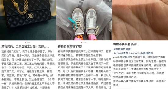 但是一直没变的,是挥之不去跟随得物的“假货”标签。时至今日,只要在社交平台上搜索“得物”二字,便可看到大量有关假货的吐槽: