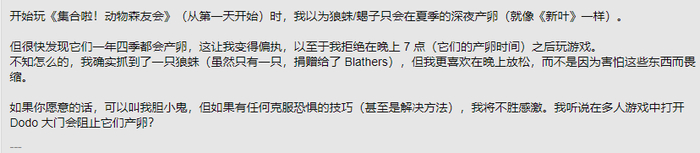 由于狼蛛是夜晚出没,外出探索还可能遇到狼蛛岛,有恐惧症玩家选择拒绝外出,表示要和自己的岛共存亡,晚上七点后也不踏出家门半步,甚至干脆夜晚不上游戏,一款老少咸宜的游戏,突然就有了赛博宵禁。