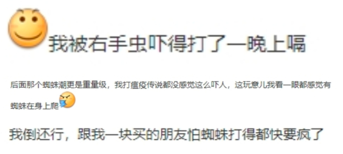 8月游戏送测后,两边人都挺急的:普通玩家想知道“游戏好不好玩”,蜘蛛恐惧症患者打听“这游戏能不能玩”。大大小小的爆料过后,蜘蛛的事很快有了结论:要暴死了,但死的是玩家。