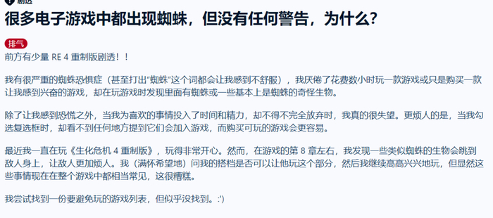 但也有例外,最近有人不仅卡关,甚至到了寸步难行,要上网求救的地步,但不是求攻略——希望有大佬做个Mod,改改游戏里吓人的蜘蛛,不然真的玩不下去。