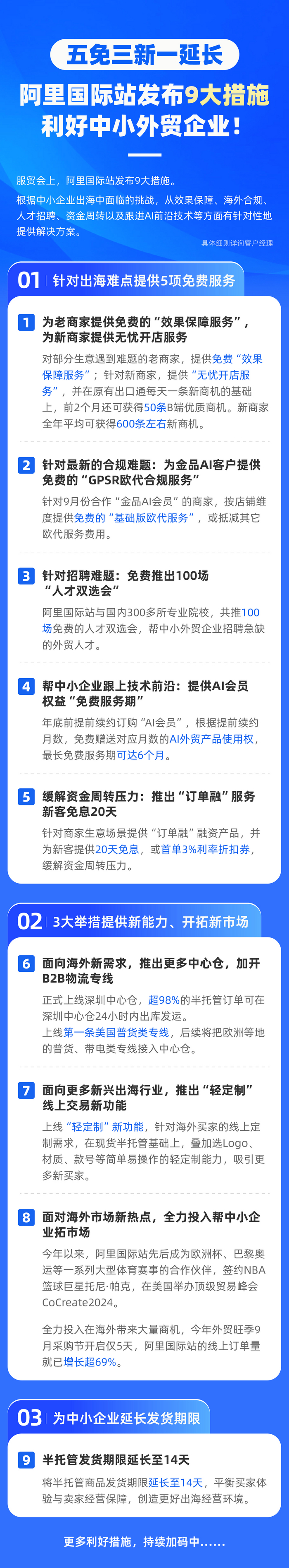 【亿邦原创】9月12日,在服贸会上,阿里国际站公布了“五免三新一延长”共计9项措施帮助中小外贸企业解决经营难题,在效果保障、海外合规、人才招聘、资金周转、跟进前沿技术等方面提供5项免费服务;在物流运输、线上交易、市场开拓等方面推出三大举措;并为中小企业延长半托管发货期限。