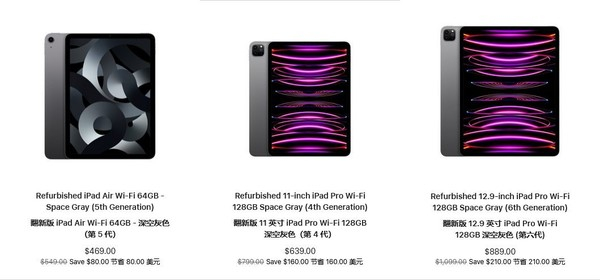 搭载M2芯片的第四代11英寸iPad Pro、搭载M2芯片的第六代12.9英寸iPad Pro和搭载M1芯片的第五代iPad Air均提供多种存储容量和颜色选择。翻新机型的折扣幅度比这些iPad的原价低15%至20%。