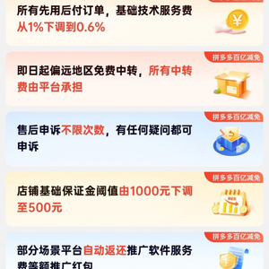 从力度方面来看,拼多多将投入百亿资源包大力扶持具有产品、技术创新能力的新质商家、新质产业带,并大幅度减免优质商家的交易手续费,未来一年预计减免100亿元;在范围方面,拼多多先后推出的政策涉及方方方面:包括技术服务费退返,推广服务费退返、下调店铺基础保证金、偏远地区中转费全由平台承担、升级商家售后服务体系等等。