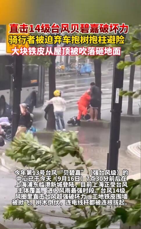 9月16日消息,据媒体报道,台风贝碧嘉登陆,并带来巨大破坏力,有网友拍到,骑行者被迫弃车抱树抱柱避险。