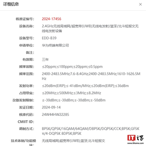 IT之家 9 月 17 日消息,型号为“EDD-B39”的华为新品通过国内工信部无线电核准和 CQC 认证。结合认证信息来看,该新品为一款智能手表,支持 UWB 超宽频、北斗短报文等功能。