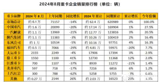 公开数据显示,2024年8月份,上汽红岩仅取得了300辆的销量成绩,与上一年同期的788辆相比,出现大幅下滑62%,在重卡企业销量排行榜中排在第十位;2024年前8个月,上汽红岩的累计销量为5258辆,同比下滑了9%,市场份额约为0.8%。