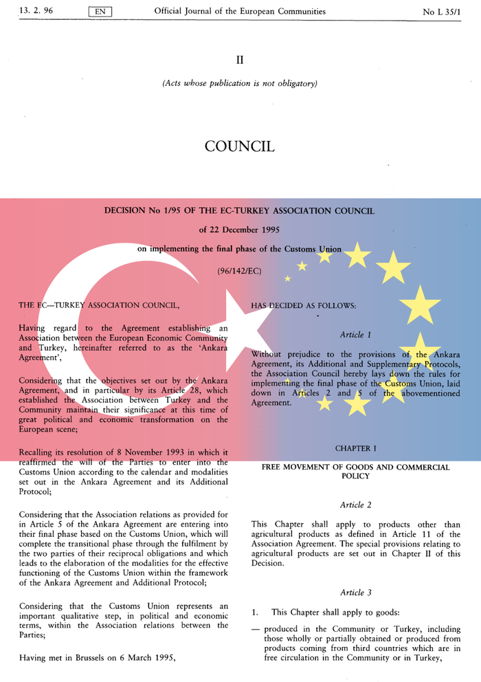 作为一个横跨欧亚两大洲的国家,土耳其一心想加入欧盟。但是直到今天,都没有成为欧盟成员国的希望。不过土耳其与欧盟的关系仍然十分密切,早在 1995 年,土耳其和欧盟就签订了土欧关税同盟协议,土耳其与欧盟之间,工业品基本零关税。