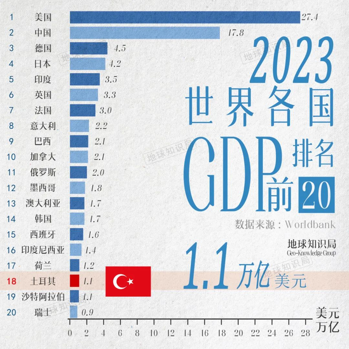 土耳其是一个拥有 8500 多万人口的大国,2023 年土耳其 GDP 为 1.1 万亿美元,全球排名第 18 位,属于准发达国家。