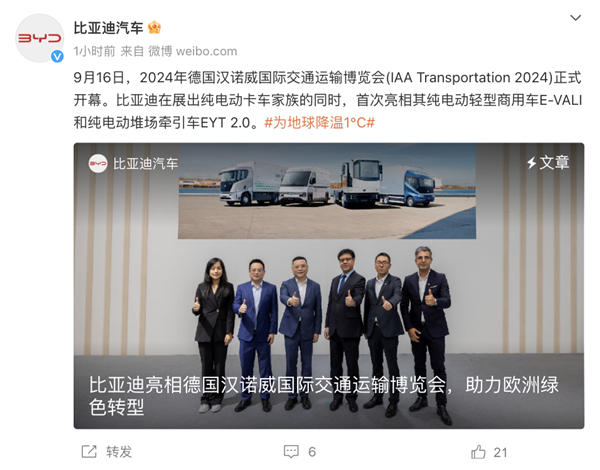 快科技9月17日消息,在2024年德国汉诺威国际交通运输博览会上,比亚迪汽车展示了其最新的纯电动卡车家族,首次亮相了专为欧洲市场设计的纯电动轻型商用车E-VALI和纯电动堆场牵引车EYT 2.0。