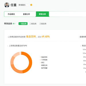 食品和家清日用品次之。任重擅长带货这两个品类,新视数据显示,近30天,任重带货6次,累计销售额170多万,其中,直播销售额最高的商品品类是个护家清,占比 58.50%。