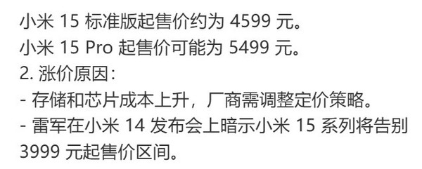 针对涨价原因,该博主分析指出,存储和芯片成本的上升迫使厂商调整定价策略。此外,雷军在小米14发布会上的暗示也进一步印证了小米15系列将告别3999元起售价的时代。