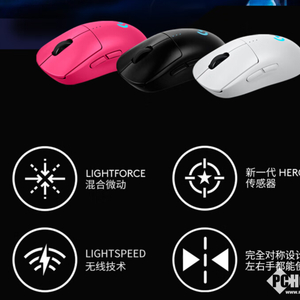 GPW4朱雀(G PRO 2 LIGHTSPEED)延续了GPW系列的完全对称式设计,可适应左/右手玩家,鼠标重量较3代有所提升,从60g增加至80g,鼠标本身配备了4个磁性可拆卸的侧键,可以随意拆除不需要的按键,提升操作准确性。鼠标按键使用罗技的机械-光学混合微动,能同时拥有机械手感和光学微动的速度,比传统机械微动快1ms。传感器依旧为罗技HERO 2传感器,最高32000DPI,500+IPS,可精准回报移动轨迹,同时借助高回报率的LIGHTSPEED技术和LIGHTFORCE的高能效,GPW4朱雀可提供长达95小时的续航。