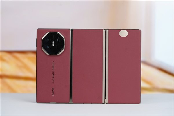 ID设计上,华为Mate XT非凡大师采用八边形镜头模组设计,机身背壳采用素皮材质,镜头下方为垂直的金属色“HUAWEI ULTIMATE DESIGN”标志。