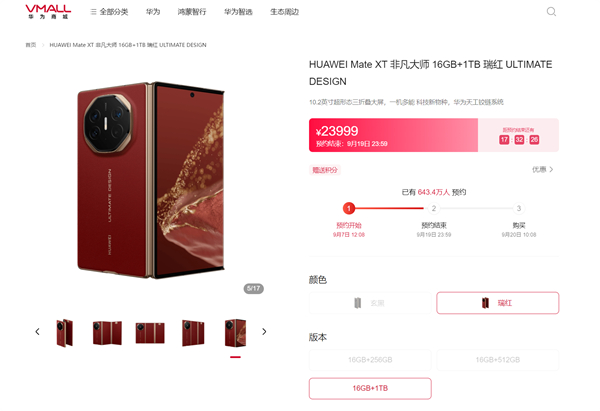 华为官网显示,目前已有643.4万人预约华为Mate XT非凡大师,预约将在今天23:59结束,同一客户仅限购买1台。