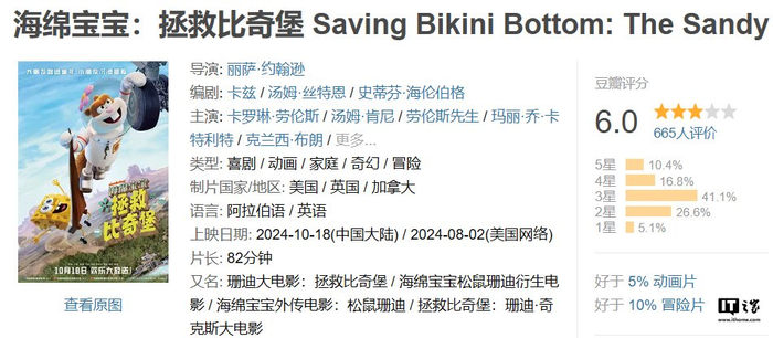 IT之家查询获悉,《海绵宝宝:拯救比奇堡》目前豆瓣评分仅 6.0,IMDB 评分仅 3.7。