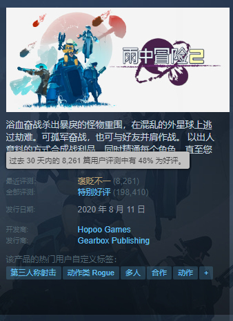结果《雨中冒险2》本体的近期好评率也被拖累到了“褒贬不一”的水平。