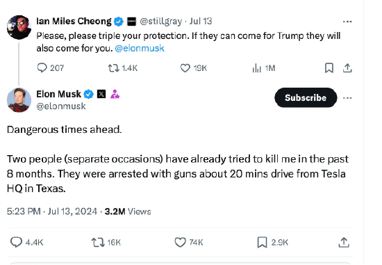 今年7月,在特朗普遭暗杀未遂事件之后,有粉丝在X平台提醒马斯克要注意安全。马斯克回复表示,“自己在过去8个月时间已经遭到两次不同的暗杀。暗杀者携带枪支在距离特斯拉德州总部20分钟车程的地方被逮捕。”