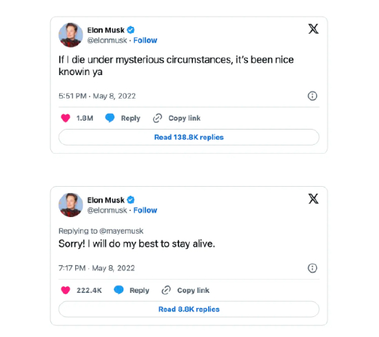 也是那一年,马斯克开始在X平台上暗示自己会遭到暗杀,“如果有一天我神秘死亡,望周知。¼¼我会努力活下去。”他还表示,“自己已经成为了坏人的头号全民公敌(Public Enemy Number One to Some Very Bad People)。”