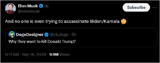 美国社会枪支泛滥严重,枪击事件不断发生,政要人物更成为了暗杀对象。马斯克随后的一条评论也成为了舆论焦点。在回复一条推文“为什么他们想杀死特朗普”时,马斯克评论道,“甚至没人想暗杀拜登或者哈里斯。”(And no one is even trying to assassinate Biden/Kamala)