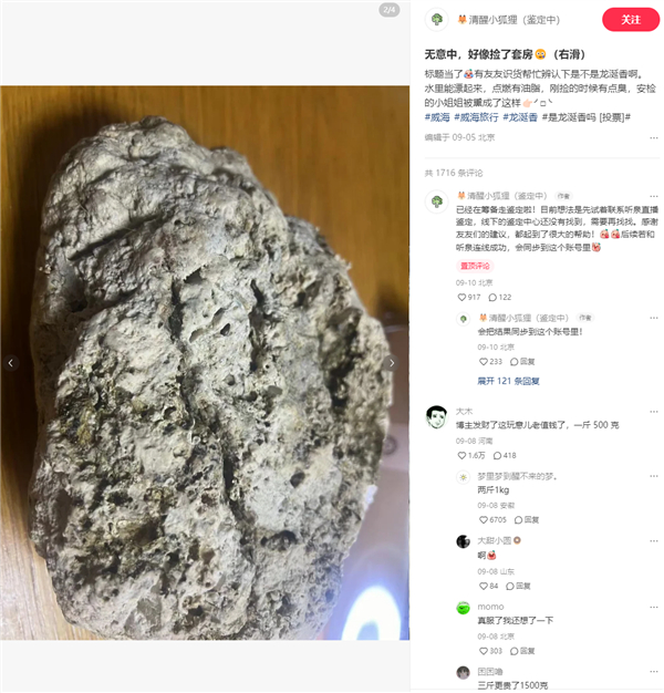 快科技9月20日消息,近日有一名北京网友发帖称,自己到山东威海旅游时,在海边赶海捡到一块约2斤重的物体,怀疑是龙涎香,在网络上鉴宝时被认为很可能是真品,1克价值8000元,价值超过800万元。