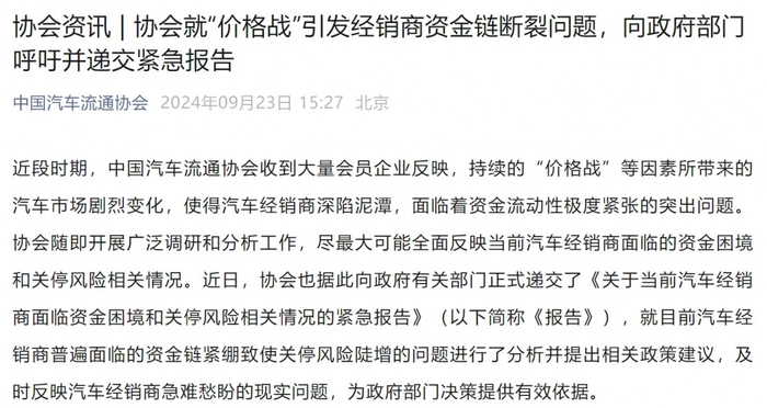 中国汽车流通协会在公众号发文称,今年1-8月,“价格战”已致使新车市场整体零售累计损失1380亿元,并向政府部门呼吁、递交紧急报告。