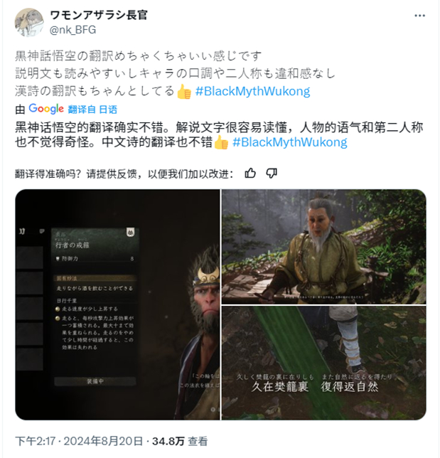 在游戏发售当天,第一批进入游戏的外国玩家就已经注意到了其中高质量的翻译。比如日语版里,不仅能很好地将诸如“久在樊笼里,复得返自然”这样的古诗句诠释得别有韵味:
