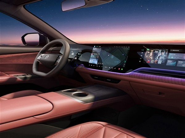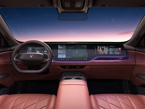 中控台上最吸睛的当属类似于奔驰的一体式三联大屏,对应尺寸为10.25英寸、14.6英寸和12.3英寸三连屏设计,车机系统支持HiCar、Carlink、T-LINK、360度全景影像,屏幕下方还配备了氛围灯带。
