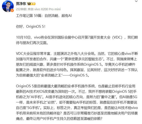 10月10日,vivo将在深圳国际会展中心举行第七届开发者大会(VDC)。本次大会除了丰富的主题演讲和八大分会场活动外,最受关注的莫过于即将发布的全新操作系统——OriginOS 5。vivo副总裁贾净东在最新工作笔记中详细阐述了OriginOS 5的核心亮点,强调了AI技术在提升用户体验方面的关键作用。