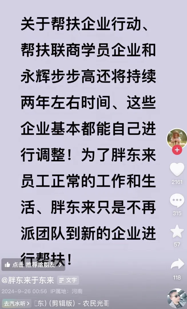 在一则视频中,于东来说道:“最低10月底,要快的话到9月底,我们就收兵,再调改企业,一个也不调。方法都告诉你们了,你们自己去学,包括我们的技术,你们想学都可以告诉你们。但是不要再让我去你们的企业了,因为太多了……”