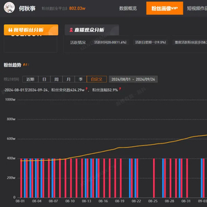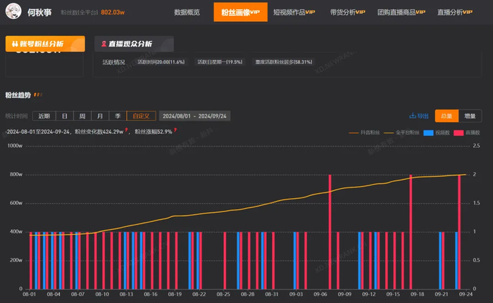 尤其今年8月和9月,“何秋亊”在抖音迅速吸粉。新榜旗下抖音数据工具“新抖”显示,近2个月,“何秋亊”涨粉424.3万,总粉丝量达到了802.7万。