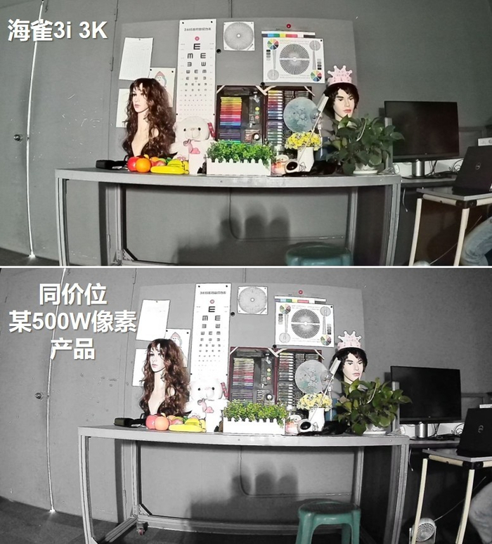 实测发现,在光照强度1Lux条件下模拟光线较暗的傍晚场景时,海雀摄像头3i3K版对比部分同价格带500万产品,海雀产品颜色更均匀、无明显噪点,色彩还原度更高。