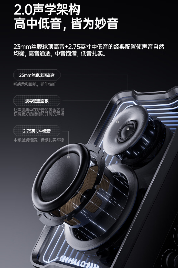 据介绍,漫步者花再 Halo 2.0 SE 多媒体音箱采用小身形设计,宽度约 12cm,采用 2.0 声学架构,拥有 23mm 丝膜球顶高音 + 2.75 英寸中低音单元配置,后置式低音倒相管,低频可下潜至 63Hz。
