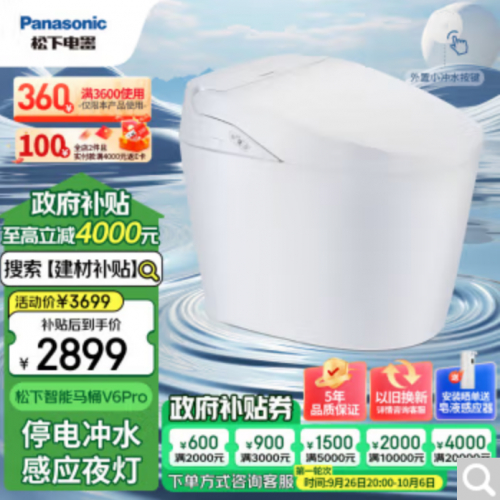 原价3699的松下V6 Pro智能马桶,使用优惠券后,到手价为2899元,更有返京东E卡以及晒单礼等优惠活动