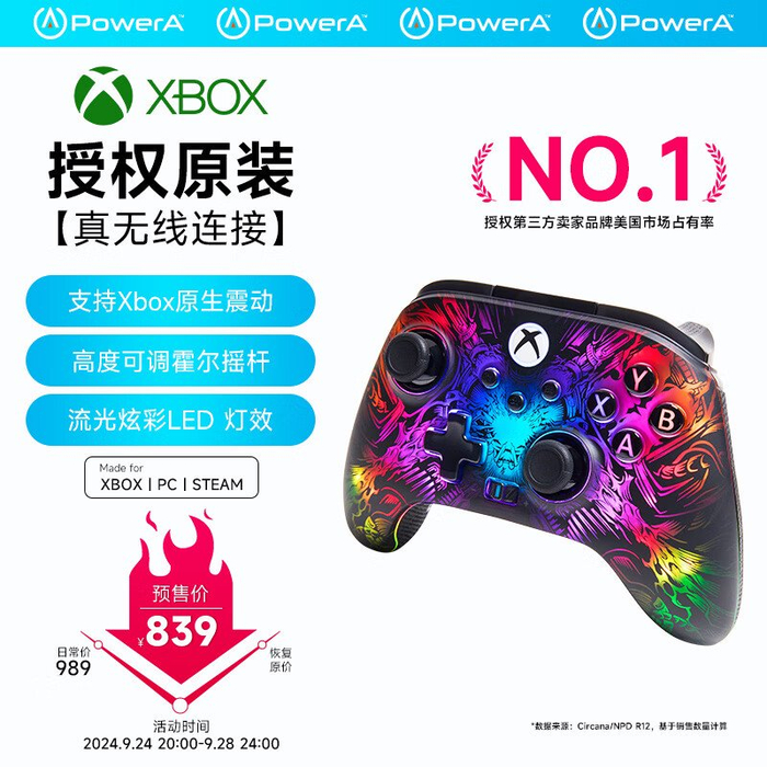 IT之家 9 月 28 日消息,PowerA Fusion Pro 无线手柄将于 9 月 29 日(明天)0 点在京东开售,该款手柄支持 Xbox 原生震动、拥有高度可调霍尔摇杆,首发 839 元。