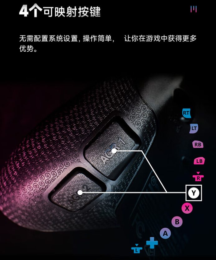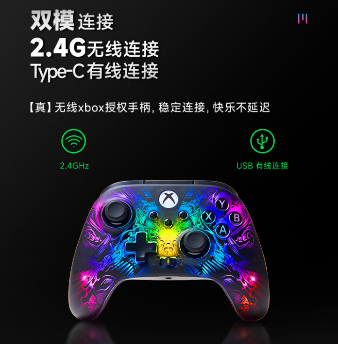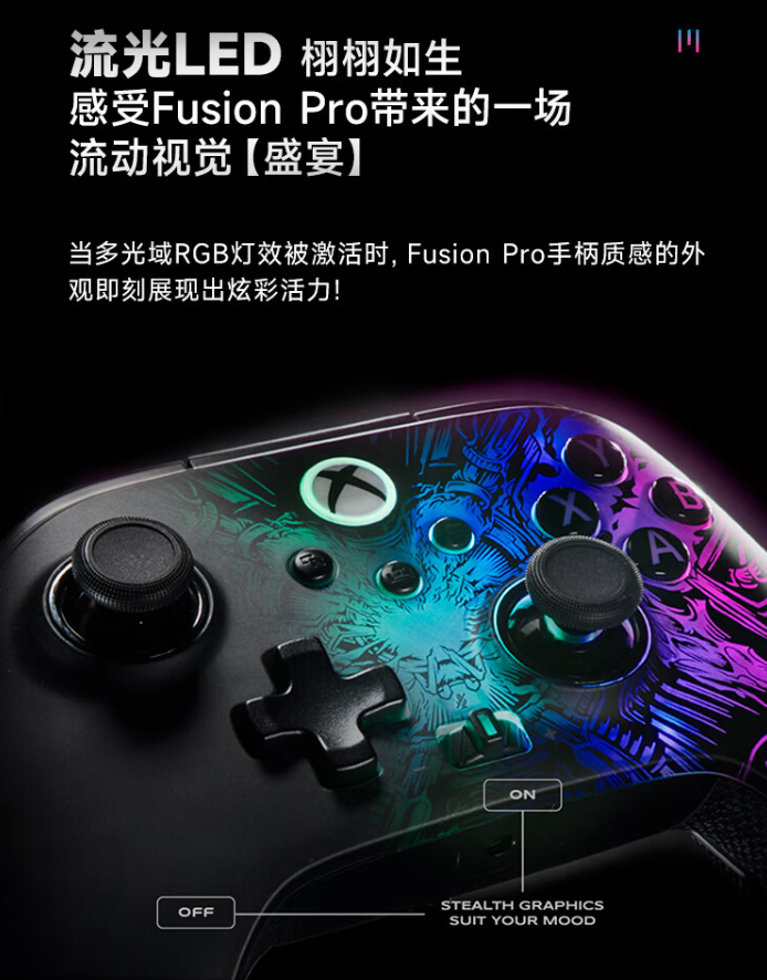 据介绍,PowerA Fusion Pro 无线手柄支持 2.4G 无线 + Type-C 有线双模连接,手柄表面拥有流光 LED 灯效,支持 4 个可定制区域,拥有 6 种独特动态发光模式。