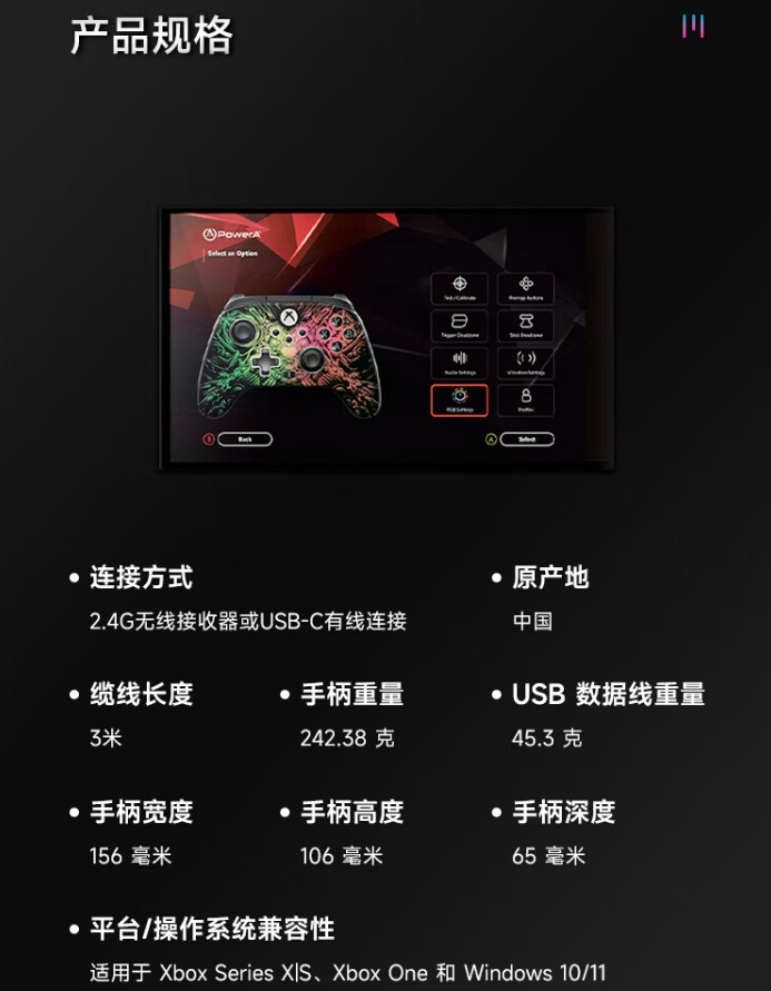 IT之家附 PowerA Fusion Pro 无线手柄产品规格如下: