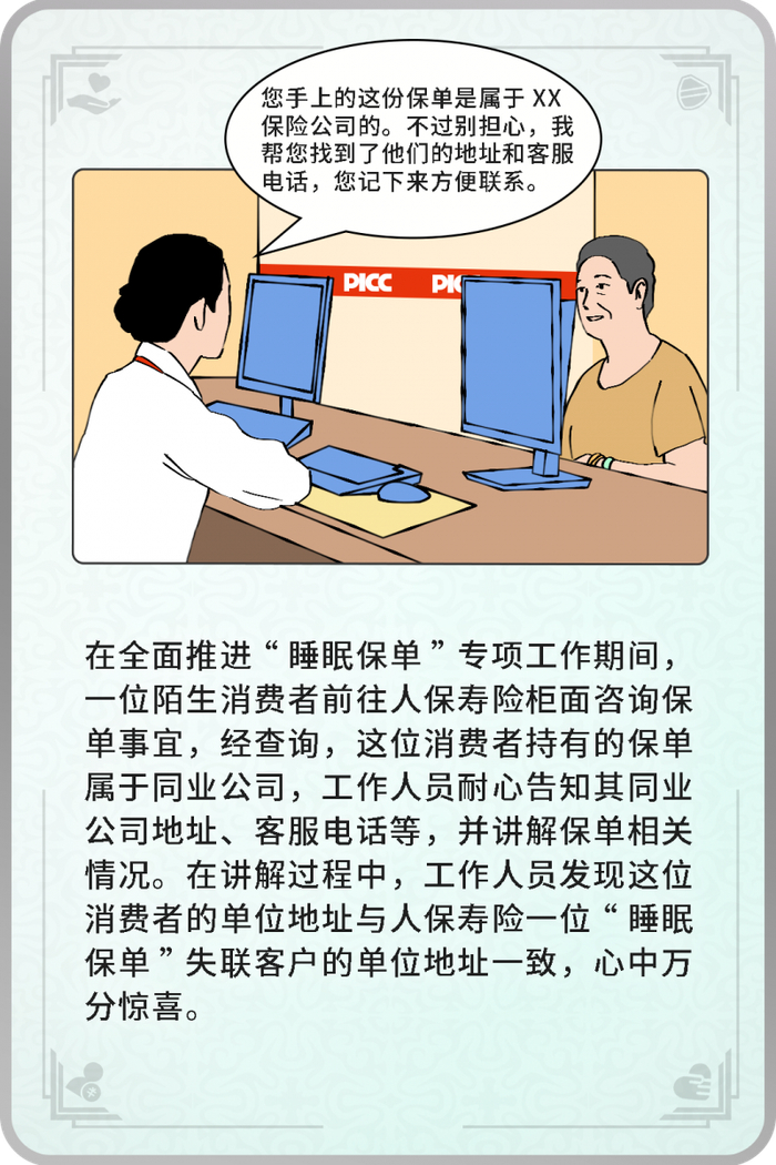 在服务的过程中,多一份责任心,就多一份希望。人保寿险不断推动“睡眠保单”专项工作向纵深推进,并落实到工作人员的日常工作之中。时时关注、刻刻用心、尽职尽责、坚持不懈,确保每一份保单的保障落到实处,为每一份沉睡的守护找到归宿。