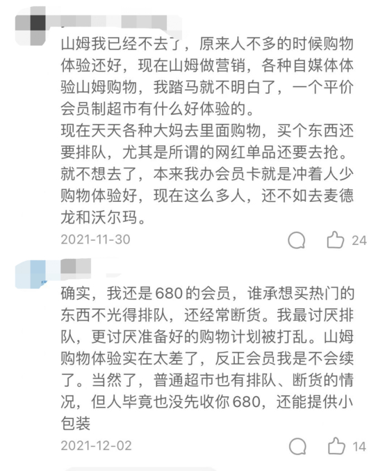 随着越来越多的年轻人去山姆体验生活、抢购网红产品,一些原教旨主义的山姆会员开始不满了,吐槽现在山姆的购物体验之差,买东西变成了抢东西。原有的购物计划全部打破,看着一群人抢牛排像极了农村大席抢菜。