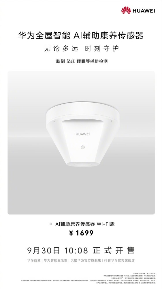 【CNMO科技消息】9月30日,华为终端官方宣布,华为全屋智能AI辅助康养传感器WiFi版10:08正式开售,售价1699元。支持跌倒、坠床等意外辅助检测,睡眠状态实时可知,支持独立安装。