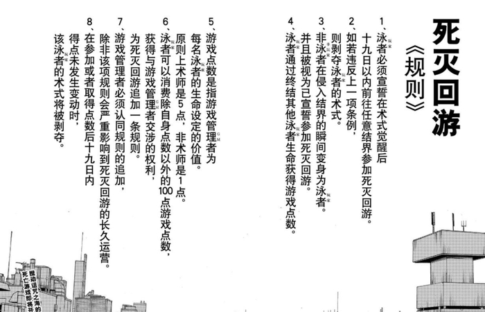 其实在「新宿决战篇」沦为网友们日常调侃的笑柄之前,「死灭回游篇」就已经暴露出了相当严重的问题。在这个篇章中,芥见下下丧心病狂地堆砌复杂的规则与设定。看上去似乎是想致敬富坚义博的经典名作《全职猎人》,不过呈现出的效果只能评价为拙劣的模仿。