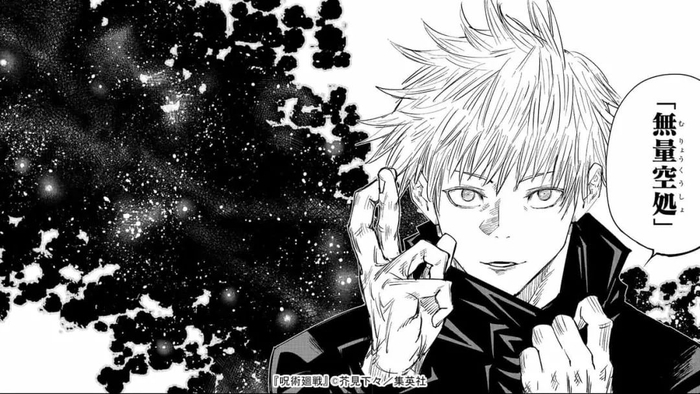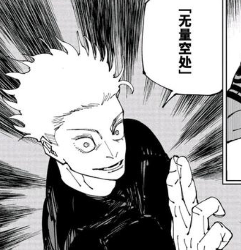 以第一次拉下眼罩展开领域的五条悟为例。读者这时候根本不需要搞懂眼罩的作用,也不必深究手势的含义。光是“无量空处”这四个意义不明的汉字摆出来,《咒术回战》的逼格就已经开始朝着它的前辈《死神》不断靠近。