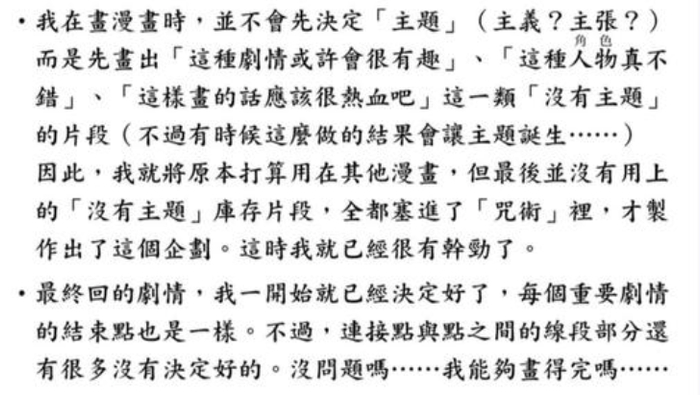 在《咒术回战》第0卷的卷尾后记中,芥见下下提到了自己的创作理念,即“动笔之前不会决定主题,而是先画出自己认为有趣的小片段”。